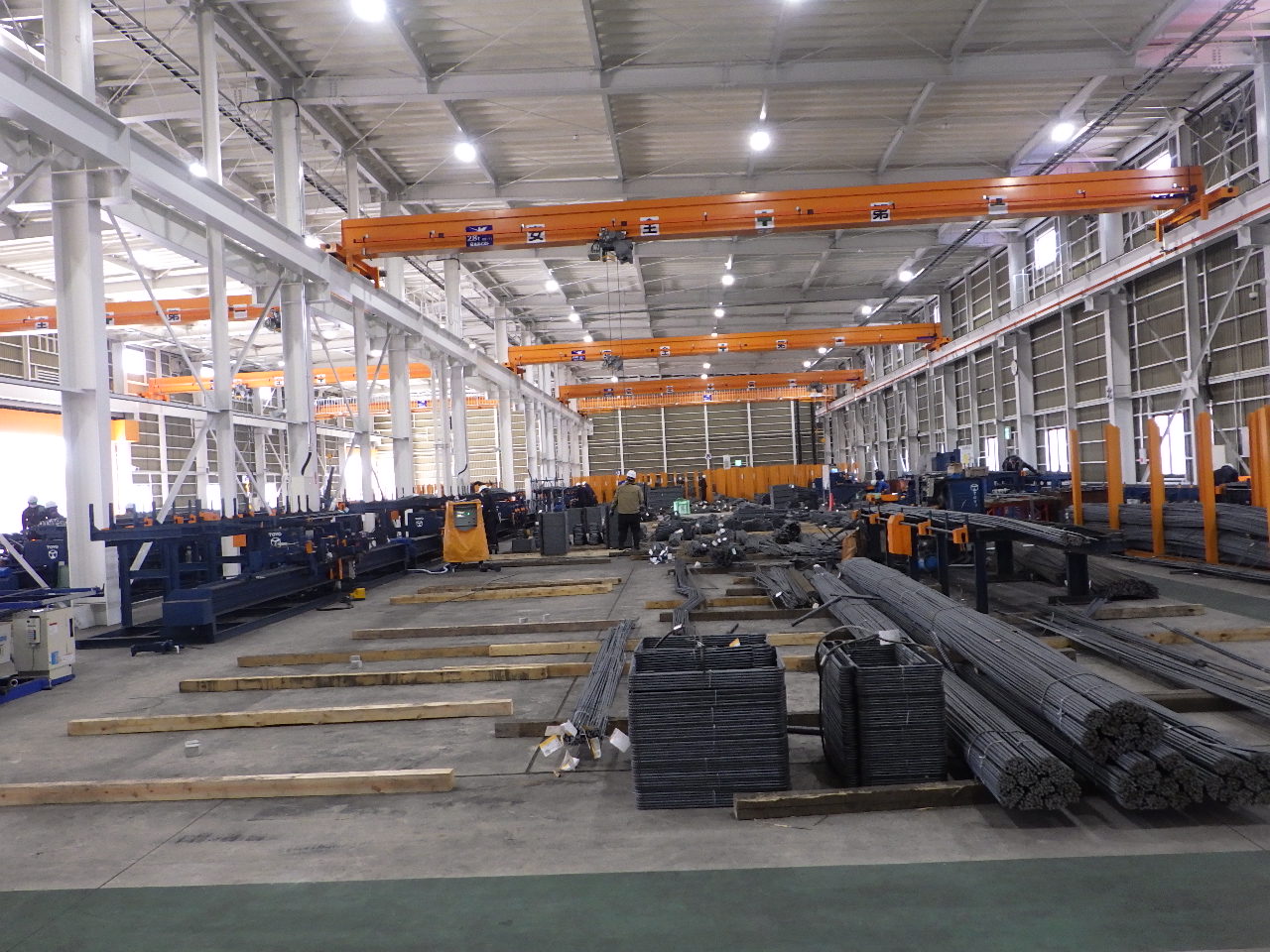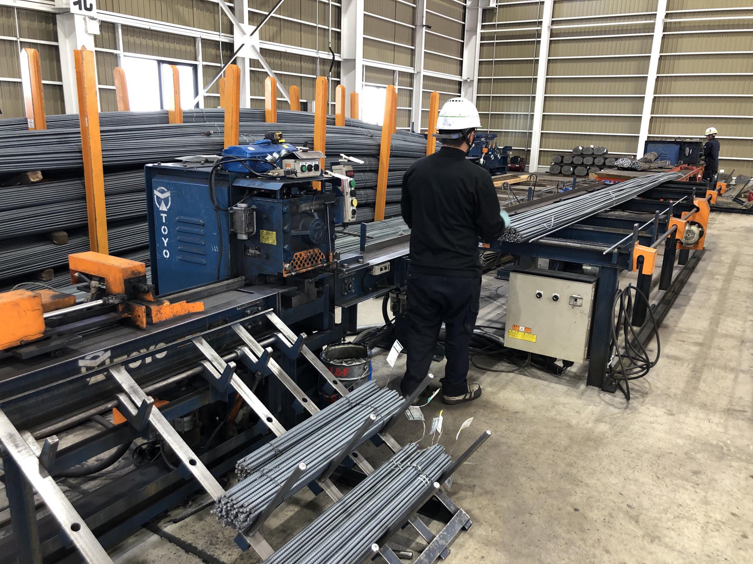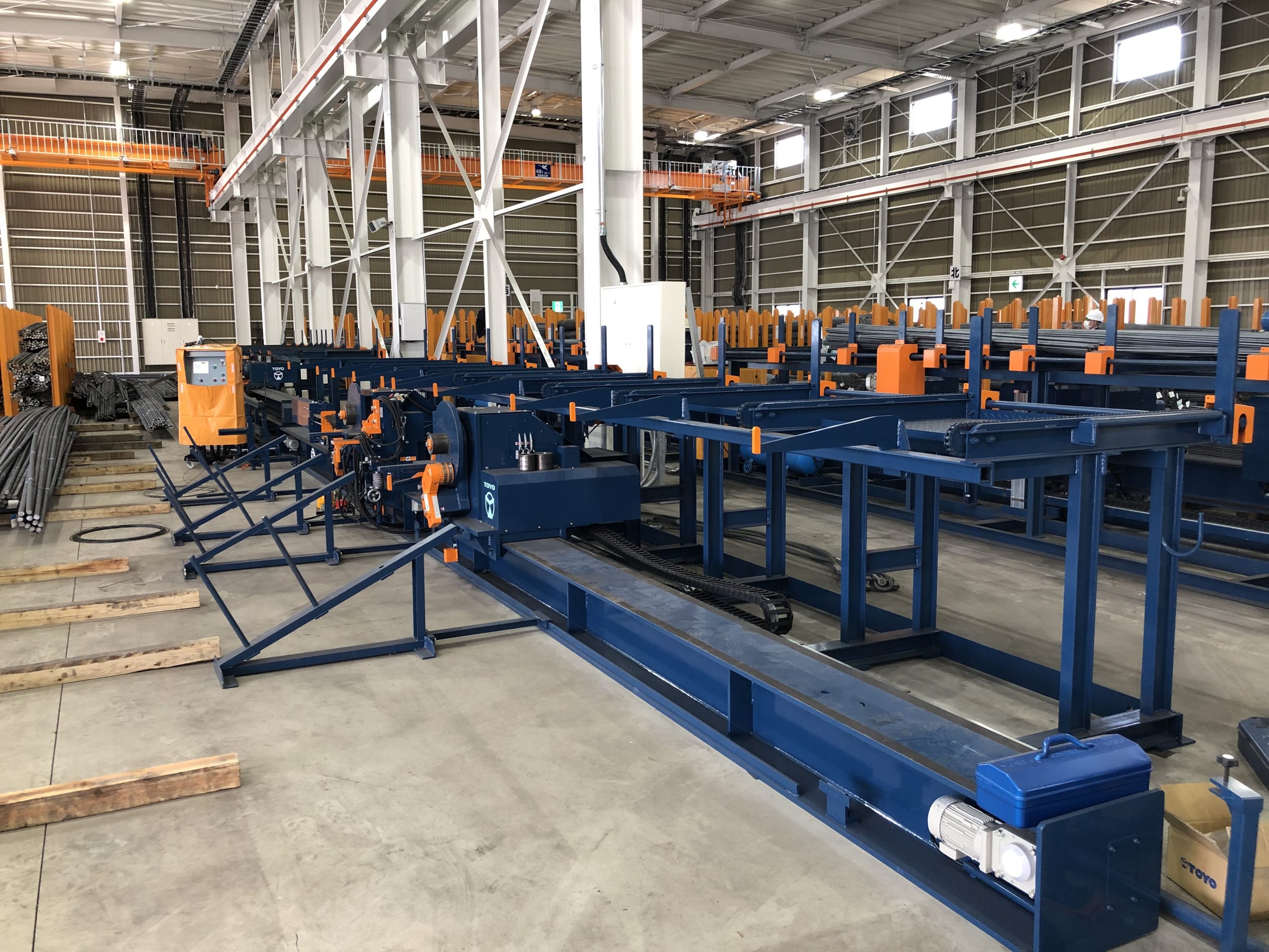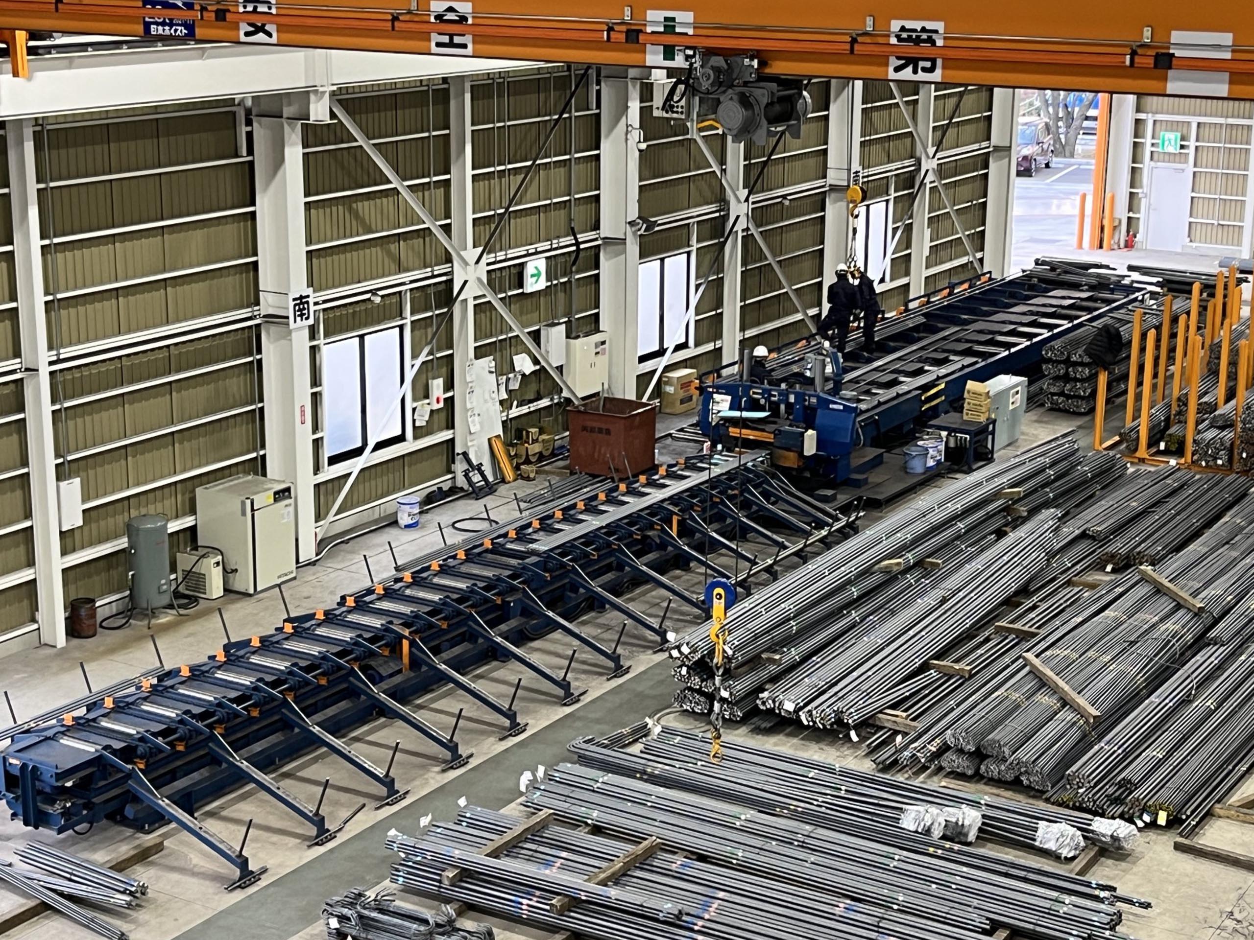 - 材料台から鉄筋を加工機へ自動供給し、曲げ・切断を自動化